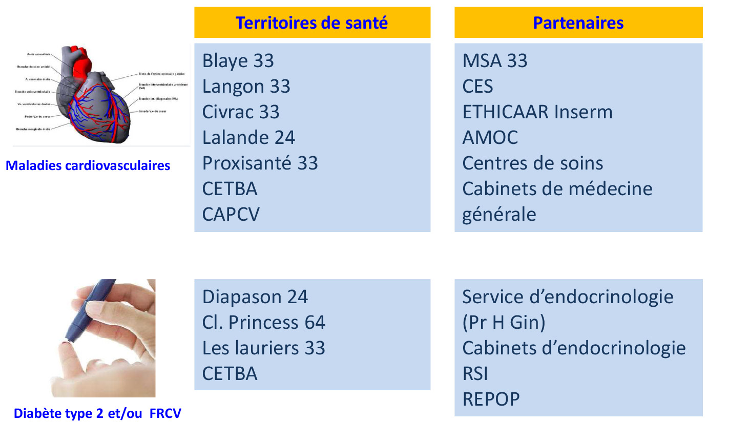 • Partenariat Hôpitaux universitaires, départementaux: Pellegrin, Robert Piqué, haut Lévêque etc., cliniques privées,